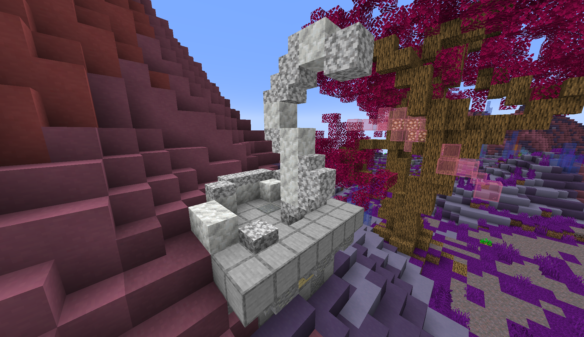 Koh's colors include black and different shades of gray, with purple accents. All of the default types of stone are associated with Koh, including stone, (deep)slate, andesite, diorite, granite, Taihryte, calcite, and basalt. Additionally, builds referencing Koh often make use of Drehmal's custom-textured Amethyst Tile blocks and vanilla amethyst blocks.