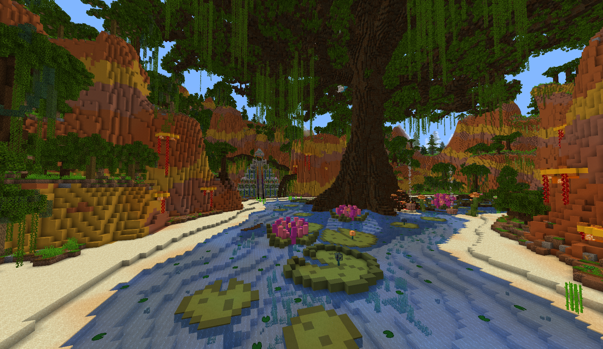 The Sapling sits in a mountain bowl with jungle terrain, implied to be that of Merijool from before the Frostfang Catastrophe. It towers over the surrounding landscape, reaching all the way up to y=256 with leaves forming a circle with a diameter of about 300 blocks at the top. The tree is made out of a blend of spruce and dark oak wood.