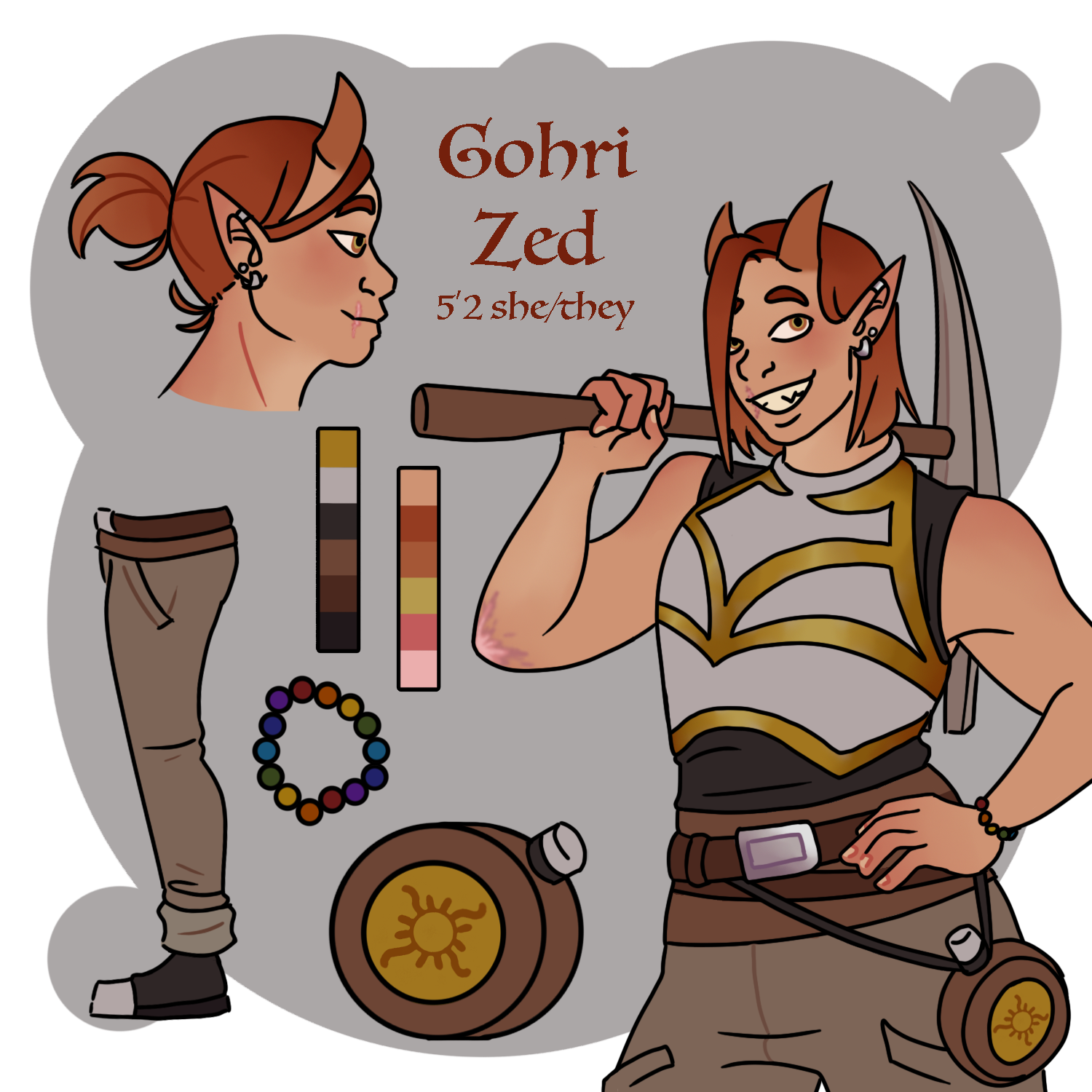 Gohri is relatively short and stout, standing at only 5'2" (~157.5 cm). She has short orange hair and short, light brown horns. She wears a rainbow-colored bead bracelet.