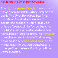 Found in a room next to Kahmas' Concern within Exodus Vault, this holotext contains some additional context on the Graviton Crucible, the tool that allowed Blue Exodus to forge Mythbreaker.