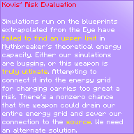 Simulations run on the blueprints extrapolated from the Eye have failed to find an upper limit in Mythbreaker’s theoretical energy capacity. Either our simulations are bugging, or this weapon is truly ultimate. Attempting to connect it into the energy grid for charging carries too great a risk. There’s a nonzero chance that the weapon could drain our entire energy grid and sever our connection to the source. We need an alternate solution.