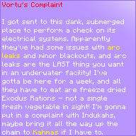 I got sent to this dank, submerged place to perform a check on its electrical systems. Apparently they’ve had some issues with arc leaks and minor blackouts, and arc leaks are the LAST thing you want in an underwater facility! I’ve gotta be here for a week, and all they have to eat are freeze dried Exodus Rations - not a single fresh vegetable in sight! I’m gonna put in a complaint with Indukahs, maybe bring it all the way up the chain to Kahmas if I have to.