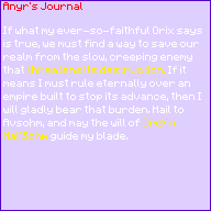 If what my ever-so-faithful Orix says is true, we must find a way to save our realm from the slow, creeping enemy that threatens its destruction. If it means I must rule eternally over an empire built to stop its advance, then I will gladly bear that burden. Hail to Avsohm, and may the will of Drehn Mal’Sohm guide my blade.