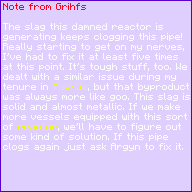 The slag this damned reactor is generating keeps clogging this pipe! Really starting to get on my nerves, I’ve had to fix it at least five times at this point. It’s tough stuff, too. We dealt with a similar issue during my tenure in Yavhlix, but that byproduct was always more like goo. This slag is solid and almost metallic. If we make more vessels equipped with this sort of reactor, we’ll have to figure out some kind of solution. If this pipe clogs again just ask Argyn to fix it.