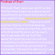 Although their gaze was obstructed, the Harmonic Eyes have discovered something truly fascinating about our own realm. From a ridiculously bright signal within Lo’Dahr, there are what must be millions of primal energy pathways flowing across the void and onto Drehmal! As soon as he saw it, Marto agreed with me that this apparent energy source must be immediately investigated more closely. I’ve begun drafting a proposal to Commander Verpyne to deploy survey drones, let’s hope they accept it!