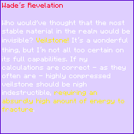 Who would’ve thought that the most stable material in the realm would be invisible? Veilstone! It’s a wonderful thing, but I’m not all too certain on its full capabilities. If my calculations are correct—as they often are—highly compressed veilstone should be nigh indestructible, requiring an absurdly high amount of energy to fracture.
