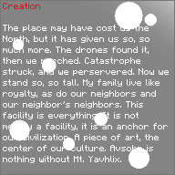 This holotext is found in a small alcove in the Primary Energy Collection Facility, stressing the importance of the facility to Avsohm and stating that it was worth the loss of the North.