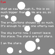 This holotext can be found at the end of a hallway, near the entrance of the Primary Energy Collection Facility. It implies that through the Resonant Eye, Avsohm saw some fundamental truth about the universe.
