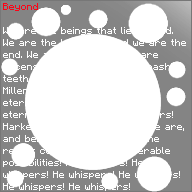 We are the beings that lie beyond. We are the beginning and we are the end. We are Apotheosis, we are Ascension. We are Ambition. Gnashing teeth and eidolism, it swallows! Millennia upon millennia, we are eternality, I am eternal! We are eternal! He whispers, he whispers! Harken silence. Hark! Bereft we are, and bereft we shall be! Let the realms collapse into unnumerable possibilities! He whispers! He whispers! He whispers! He whispers! He whispers! He whispers!