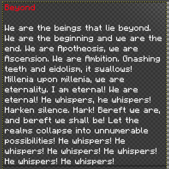 While this holotext is mostly illegible, a full, uncensored version was once a part of the resource pack, shown below. This text seems to be written by Those Beyond.