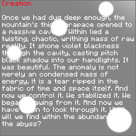 Found at the far western end of the Primary Energy Collection Facility, this holotext asserts that within the center of the mountain is a tear in the fabric of space and time.