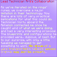 As we’ve iterated on the rings’ runes, we overcame a major limitation in their technology. Now there are lots of very practical implications for what this could do. Technician Vortu aboard the Aphelion contacted me once he caught wind of what we were doing, and had a very interesting proposal. The blueprints and configurations he provided were… dubious, at best. But to our surprise, with only a little tweaking we managed to get something to work. His dream of a warp transportation network across Drehmal may just be a reality…