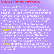 As soon as I flip this switch, hydroelectric power generation will cease! That was this facility’s original purpose, after all, as we had no practical way of piping primal energy off Drehmal and onto Lo’Dahr. As it turns out, we didn’t end up even needing to! With the discovery of the Numencore, we can draw all the primal energy we need locally and expand our enterprises here on the Divine Moon. As a power specialist, my job here is done. I’m now off to the Core Facility where my skills will continue to be used for the glory of Avsohm! Hail to Avsohm!