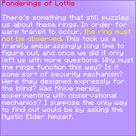 There’s something that still puzzles us about these rings. In order for warp transit to occur, the ring must not be observed. This took us a frankly embarrassingly long time to figure out, and once we did it only left us with more questions. Why must the rings function this way? Is it some sort of security mechanism? Were they designed expressly for the blind? Was Khive merely experimenting with observational mechanics? I suppose the only way to find out would be by asking the Mystic Elder himself.