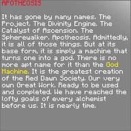 It has gone by many names. The Project. The Divinity Engine. The Catalyst of Ascension. The Spherewalker. Apotheosis. Admittedly it is all of those things. But at its base form, it is simply a machine that turns one into a god. There is no more apt name for it than the God Machine. It is the greatest creation of the Red Dawn Society. Our very own Great Work. Ready to be used and completed. We have reached the lofty goals of every alchemist before us. It is nearly time.