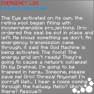 The Eye activated on its own, the retina pool began filling with incomprehensible projections. Orix ordered the seal be put in place and left. He knows something we don't. An emergency transmission came through, it said the God Machine is being activated. The fools! The energy grid isn’t ready! They’re going to cause a network collapse! Oh by Drehmal, I’m going to be trapped in here… Someone, please save me! Orix! Thresa! Anyone!! I’m sorry!!! Wait… I hear a noise coming through the hallway. Hello? Who's there? Rescue?!