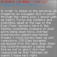 In order to observe the advance, we triggered an unlogged dive to watch through the retina pool. I almost wish we hadn’t. Forty-one soldiers and scientists, dead at the maw of the Ever-Fear. Workers here in the facility, completely unaware of what we’re doing down here, started experiencing widespread mental breaks. I could barely keep my own composure. CSO Eleis escaped, paralyzed from the neck down. When she could broadcast a signal, she told me not to abort. Orix has reassured me that Tethlaen will submit. I hope he’s right.