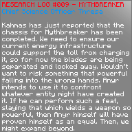 This holotext can be found at the Resonant Eye, deep within the Resonant Halls. Written shortly after the forging of Mythbreaker, it details Anyr's plans for the blade.
