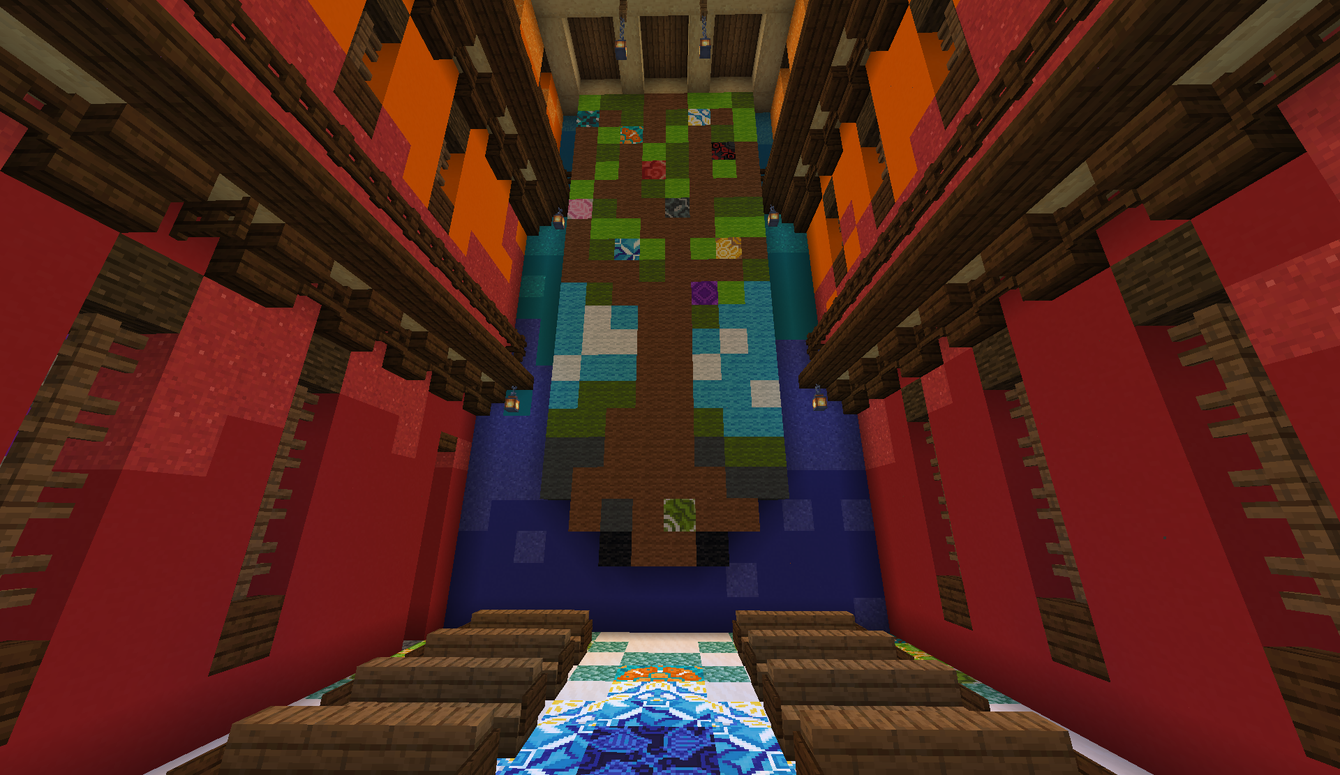 Look beneath one of the spruce stairs on the other side of the room to find a lever. Flicking this lever opens a hole in the wall down to a secret, underground building, seemingly depicting a bar and lounge. This building's interior is heavily decorated with custom banners.