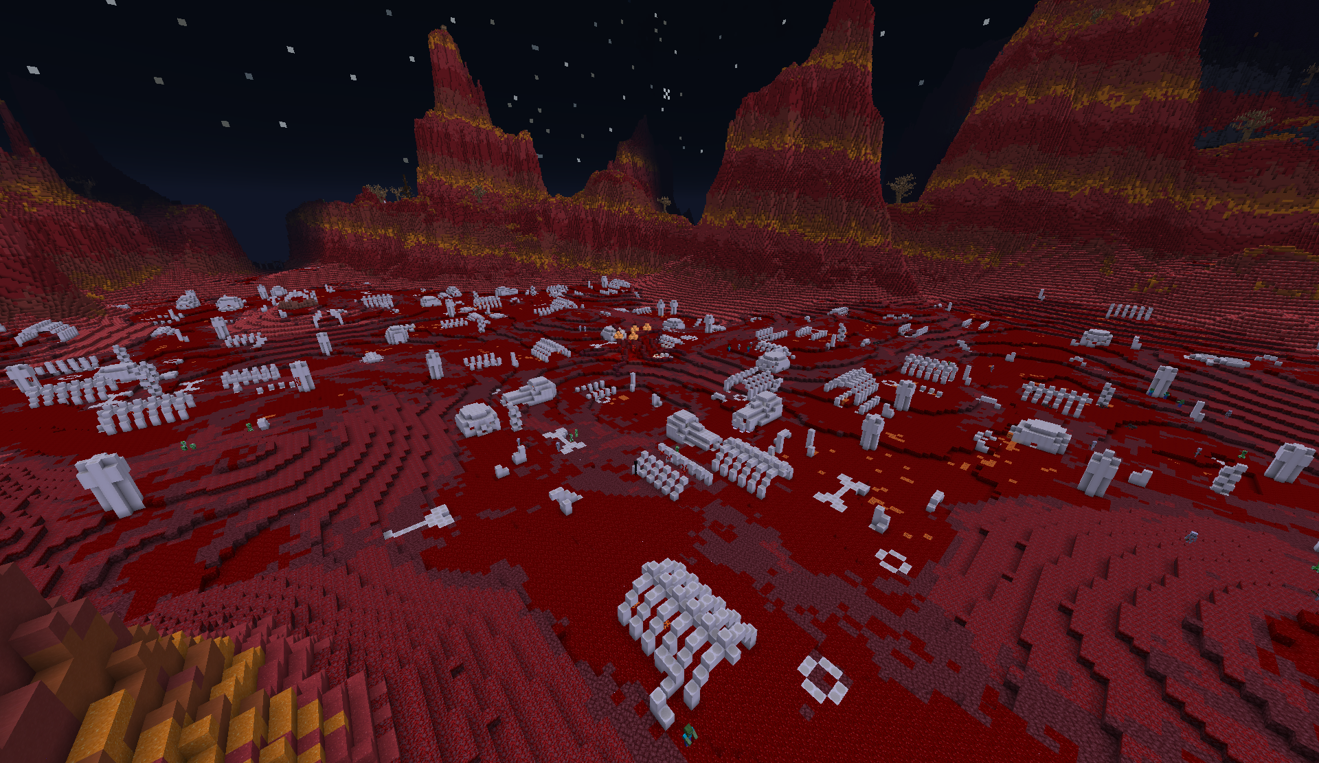 The Birthing Grounds takes the form of a valley within the normal terrain of the Carmine, with deeper red blocks replacing the red/orange sand and terracotta found elsewhere in the region. These blocks include Taihryte (netherrack), crucible wart (nether wart) blocks, and carnelian (crimson) nylium.