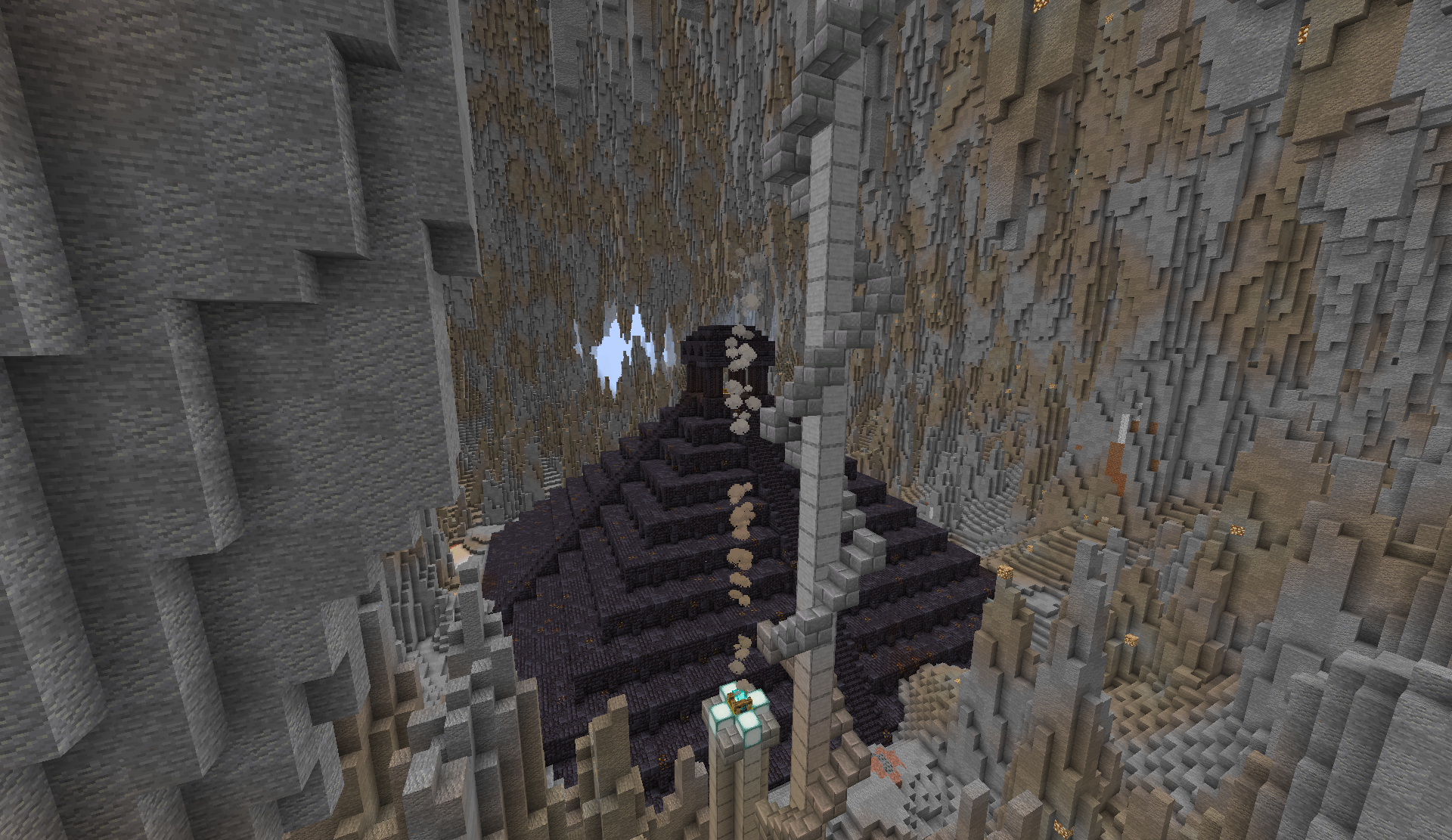 A ladder down from an otherwise inconspicuous room in the northwest leads to a room with 6 valuable blocks (3 iron blocks, 2 scale blocks, 1 gold block), with a spiral staircase. This staircase continues downwards for about 170 blocks, eventually opening into a vast, dark cavern.
