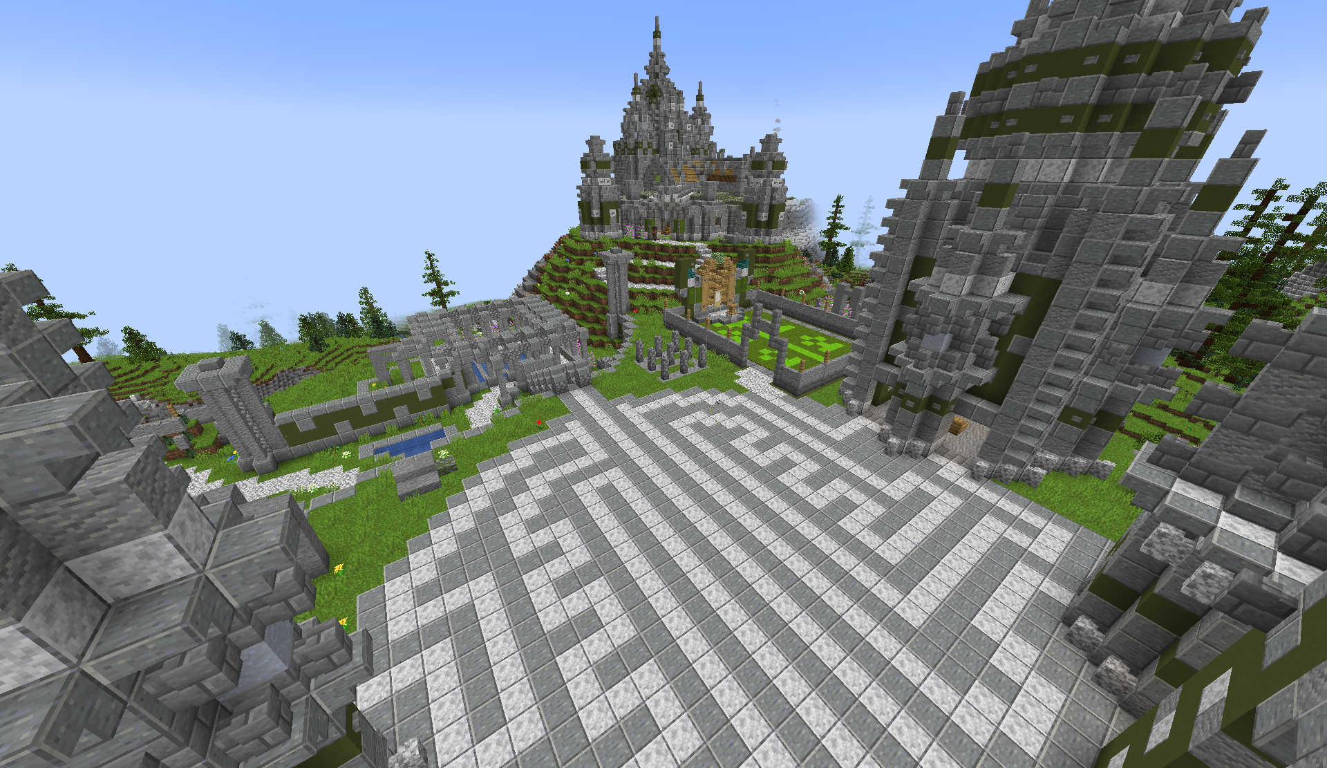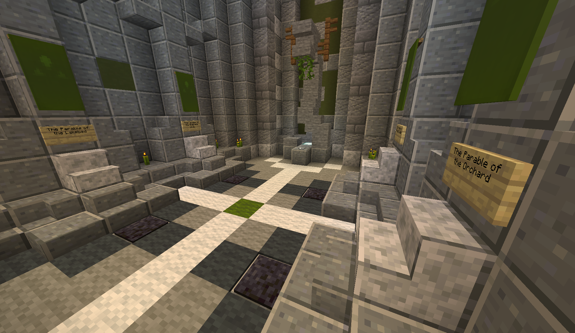 Drehua Temple has a relatively linear layout, with a single winding path made of diorite in the ground, symbolically representing Drehmal themselves. At the beginning of this path, an infused amethyst block with the Welcome to Drehua Temple book is found, which provides a hint toward the accepted devotion offerings for Drehmal. The path winds through the gardens at the front of the temple, leading up to the shrine and then through to the monks' living quarters, which contain the Parables.