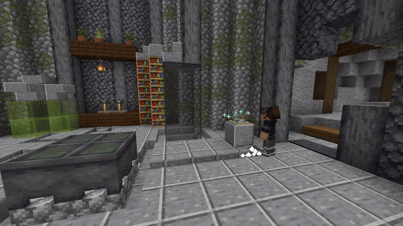 The main content is found underground, down a staircase in the main castle. At the bottom of this stairway, players will find a room filled with enemies, including an Evoker. A lever can be flipped in order to start an animation, resulting in the creation of a small structure.