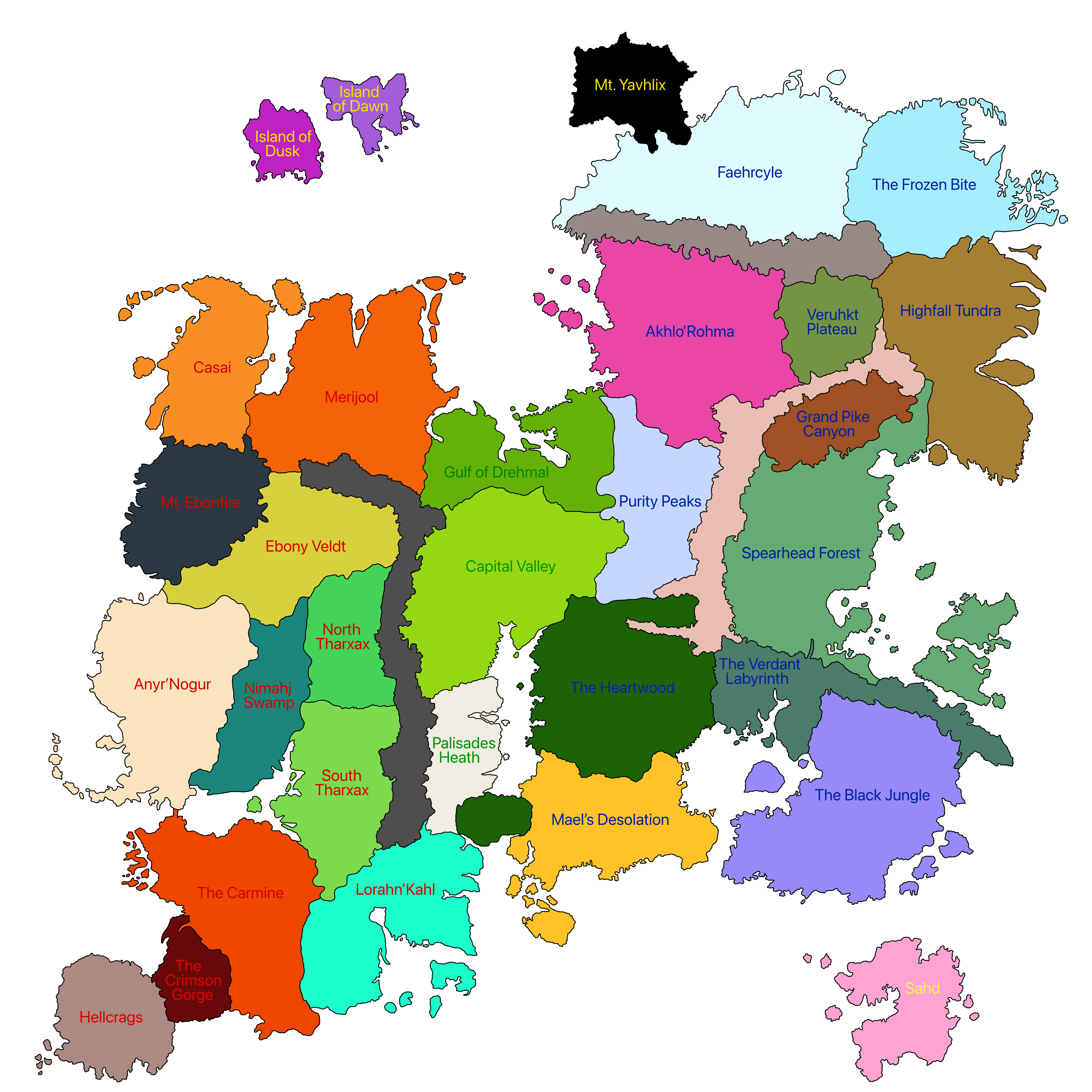 The land of Drehmal is divided into 31 different regions, each of which has distinct terrain features and (with the exception of the Crimson Gorge and Verdant Labyrinth) a Terminus tower. Regions can be further subdivided into areas defined by mini-biomes.