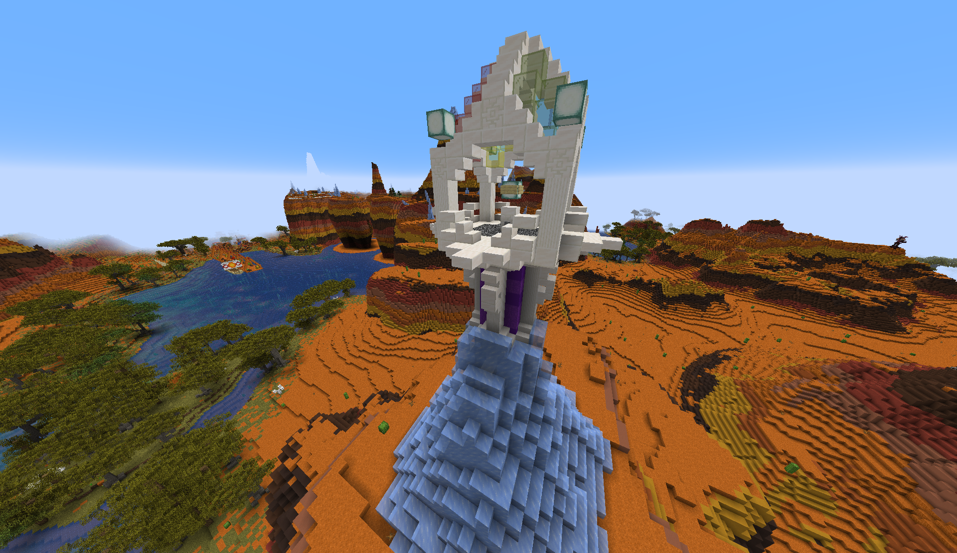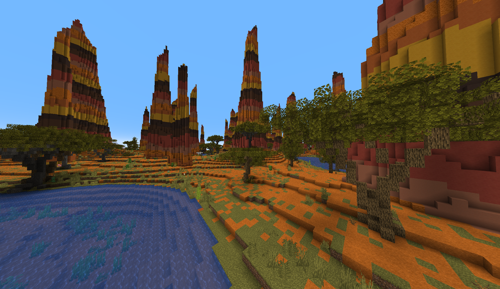 - Area with some acacia trees and red, orange, yellow and brown striped spires in center