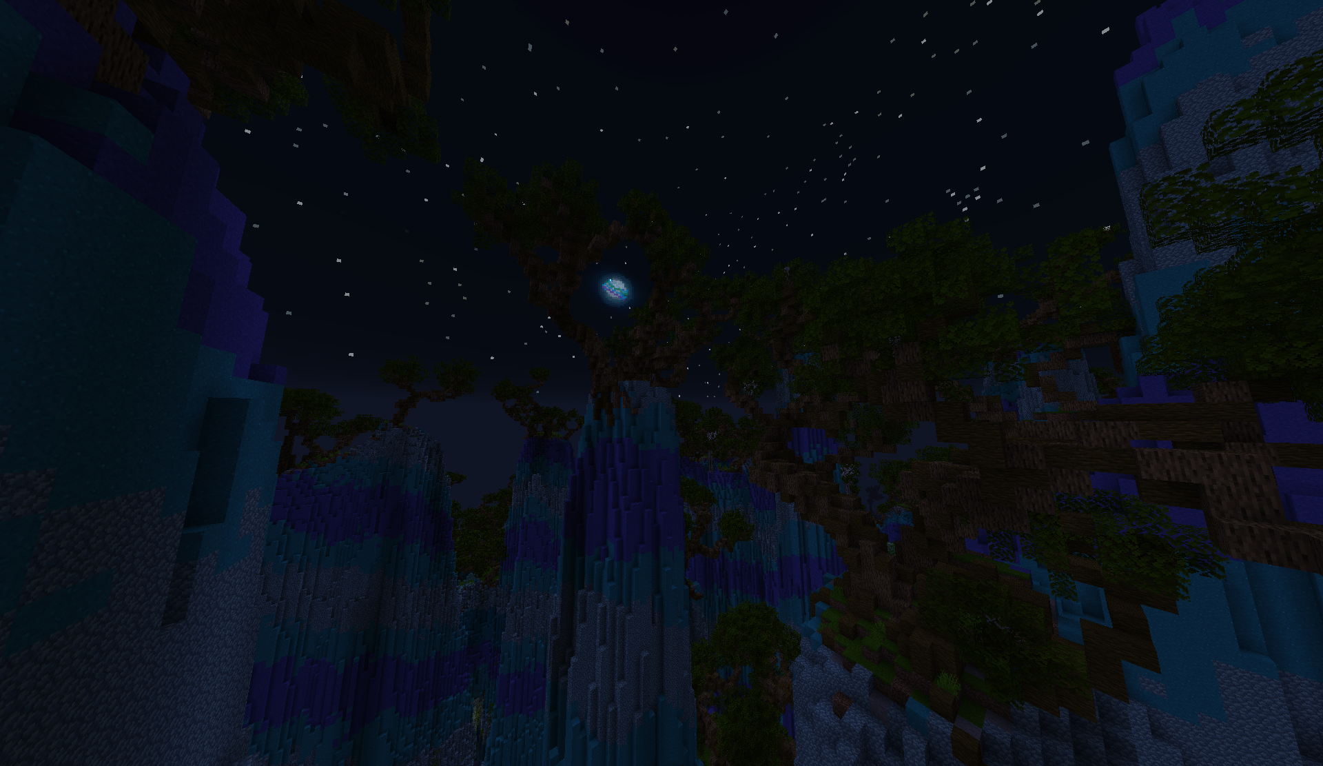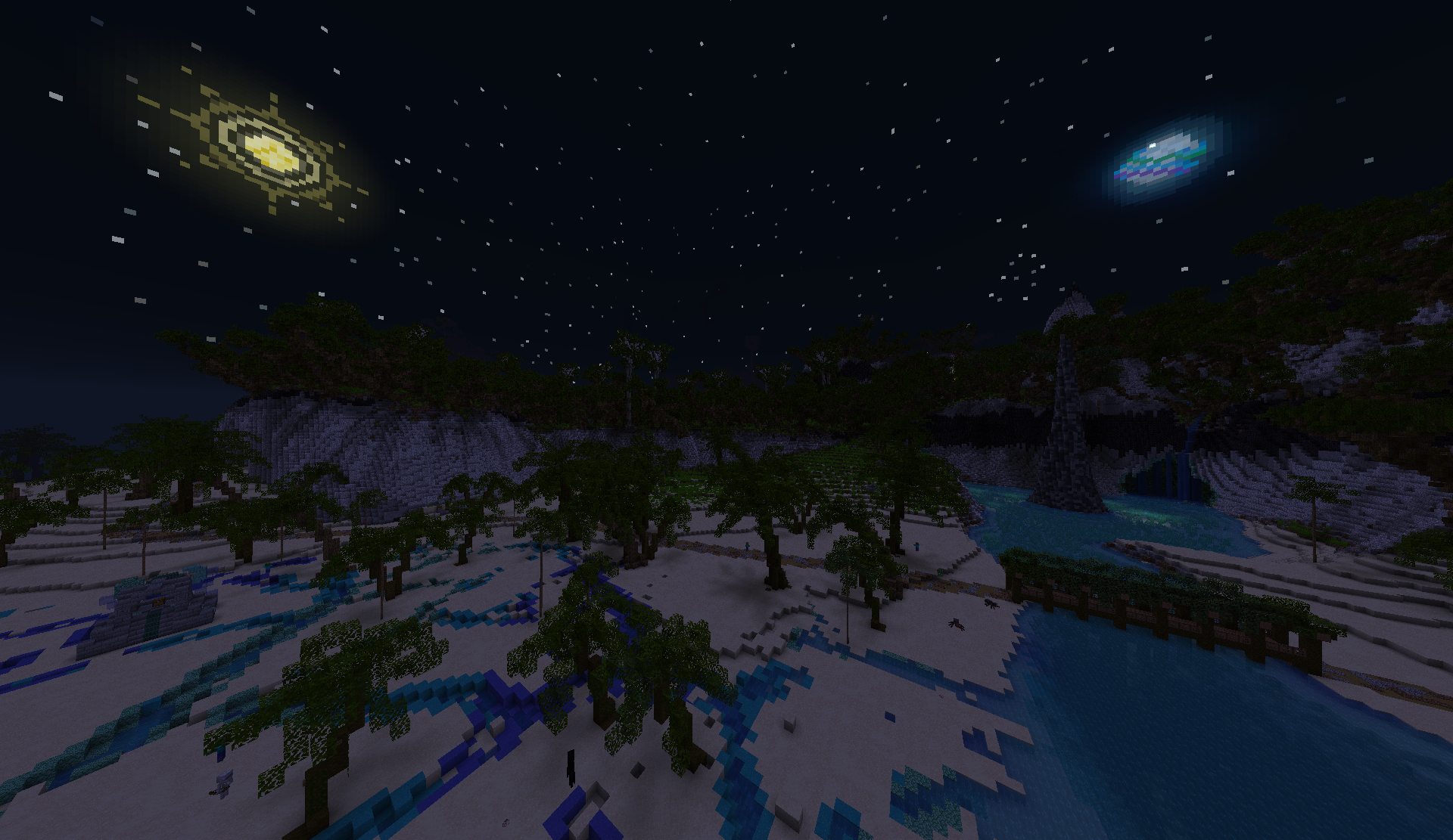 Lorahn'Kahl is a tropical forest, with trees of jungle wood and birch (the latter for aesthetic purposes). The terrain is also home to bluffs and natural spires with blue and cyan stone. In the north are some areas that are more grassy with less trees, and on the coast in the south and east are wide, sand beaches. A few islands also inhabit the waters offshore. The sea appears brighter around Lorahn'Kahl due to its biome configuration as a warm ocean.