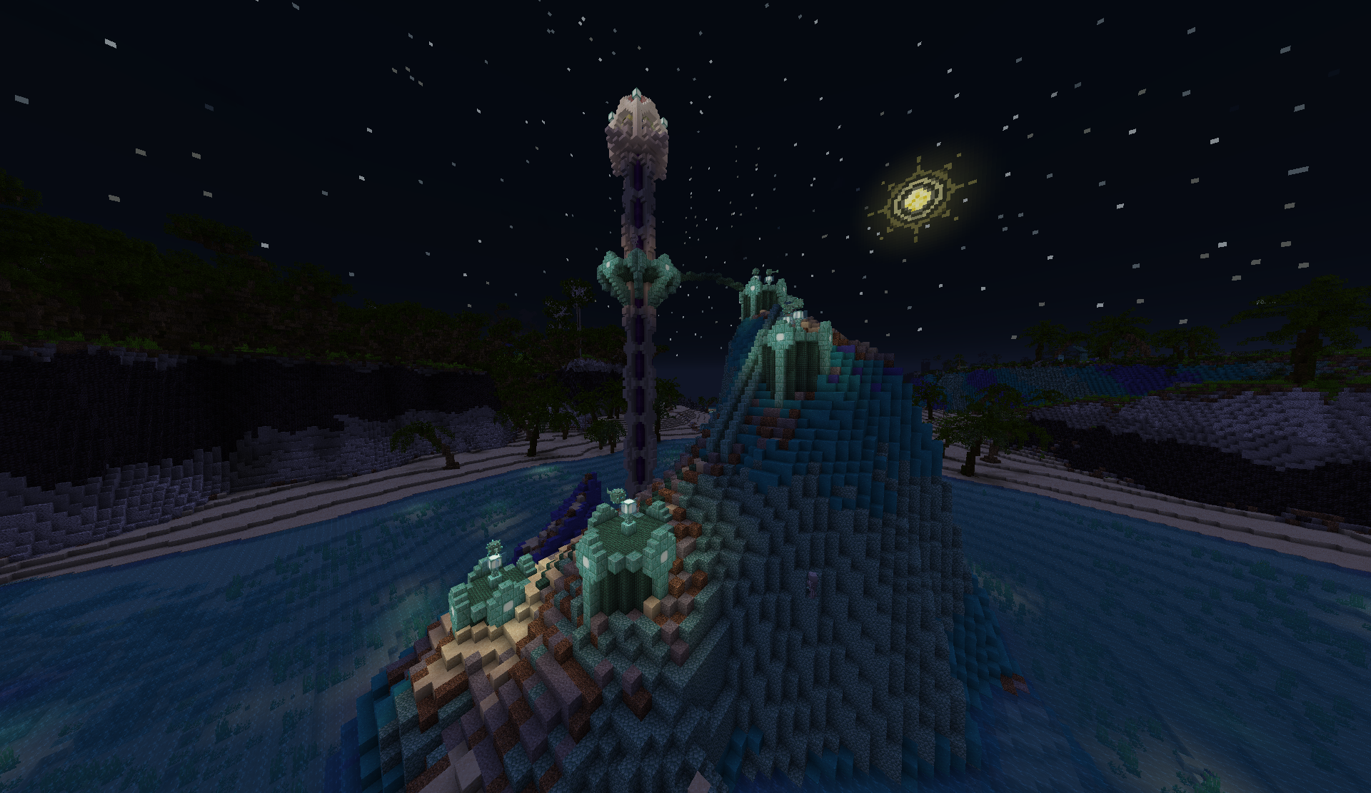 Lorahn'Kahl's Terminus tower is situated in the middle of a small, mostly-enclosed bay in the region's geographical center, connected to the ocean via a narrow strait. It stands next to a blue and cyan rock jutting out of the water. A prismarine staircase leads to the top of this rock, and a bridge joins its summit to a point on the tower's midsection. The way is guarded by hostile Moonborn Constructs (Guardians), Undead Theocracy Sentinels (skeletons), and an Undead Theocracy Warden (witch).