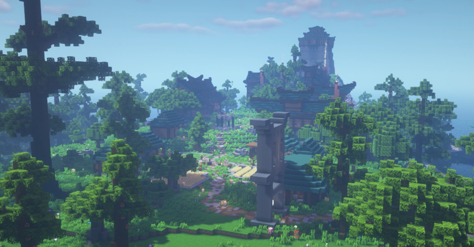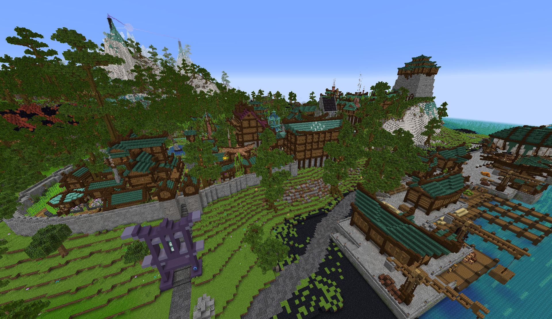 Firteid takes heavy inspiration in its architecture from traditional East Asian architectural styles. Buildings are predominantly constructed with a combination of spruce and dark oak wood, in addition to blue-green or red roofs, made of dark prismarine, carnelian planks, oxidized cut copper, or prismarine.