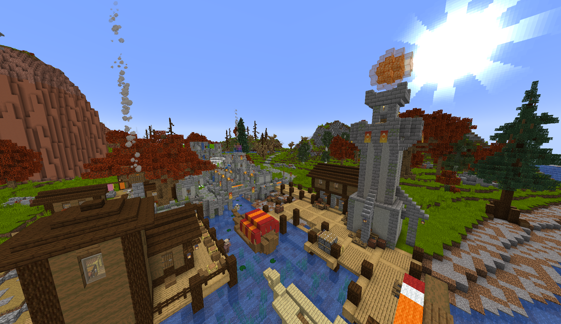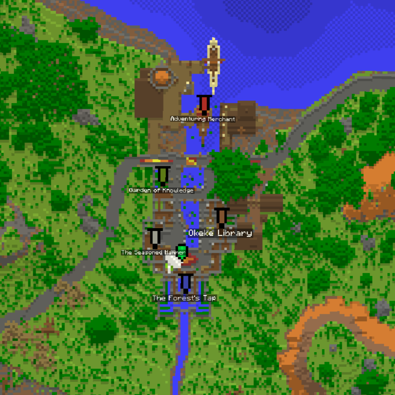 Okeke is a relatively small town, built directly along a stream that connects two lakes. It features mostly simple buildings of stone brick and clay, with some buildings on the town's outskirts more heavily featuring spruce and dark oak wood.