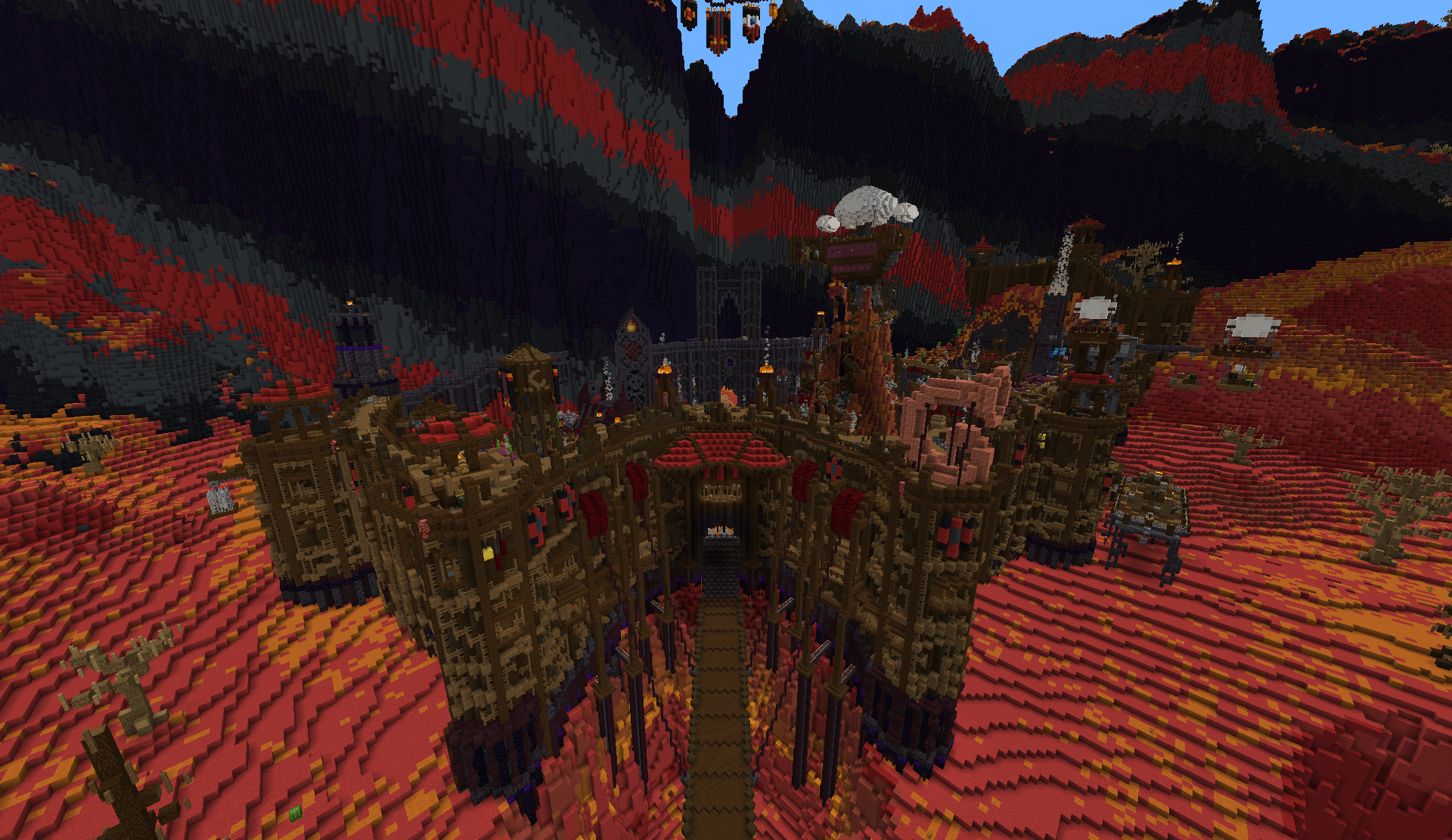 Rhaveloth is one of the densest areas on the map, with several different layers of buildings and districts throughout its land area. Buildings are varied, often utilizing spruce and dark oak wood, blackstone and its polished/brick variants, Taihryte and red Taihryte (nether) bricks, and carnelian (crimson) wood.