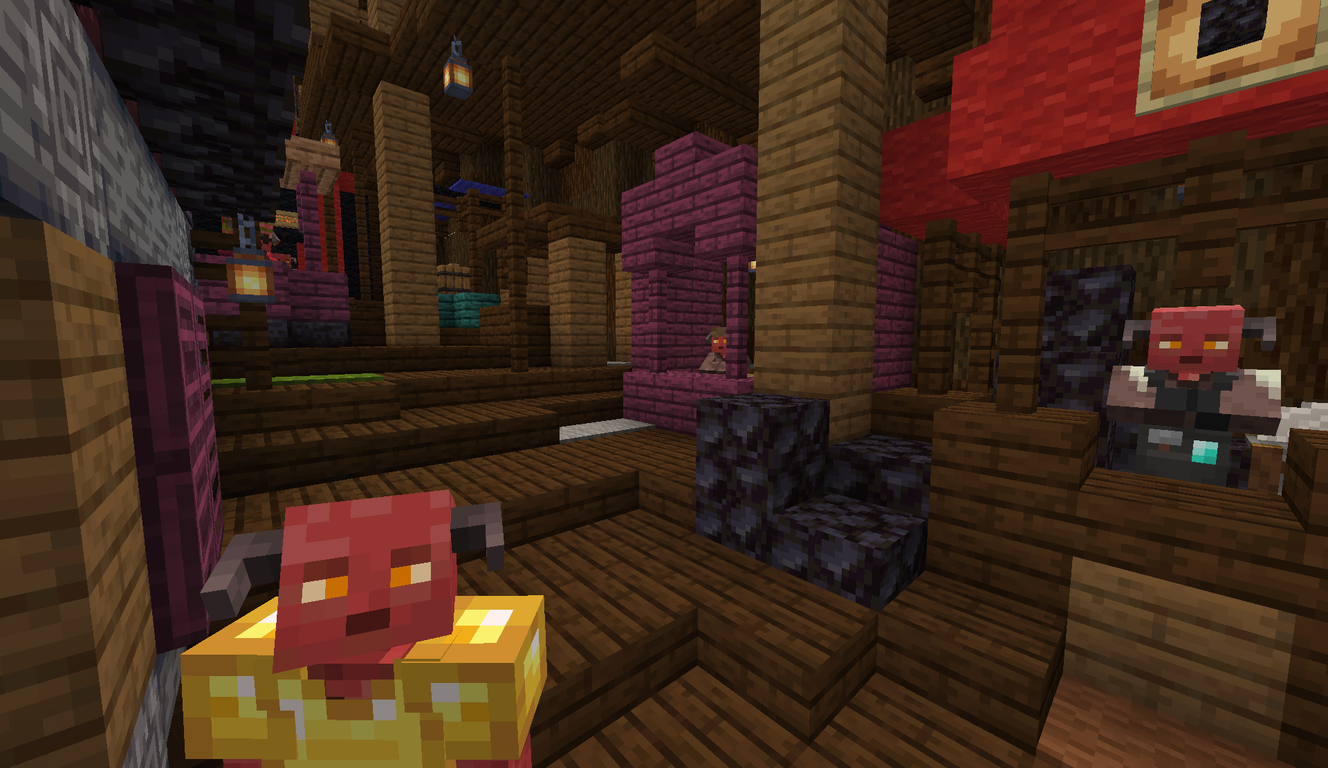 As Rhaveloth is made up overwhelmingly of Maelmari, who are (mostly) re-skinned vanilla Minecraft piglins, players seeking to explore Rhaveloth will need to be prepared to fight their way through dozens to hundreds of enemies. Most of the Maelmari are regular piglins, meaning that they can be distracted with gold or made passive if a player wears golden armor, but there are many Maelmari Brutes in the town as well, who cannot be pacified. Maelmari will respawn passively in the area, making population estimates difficult, but there are typically between 150 and 200 inhabitants in Rhaveloth upon a player's first arrival.