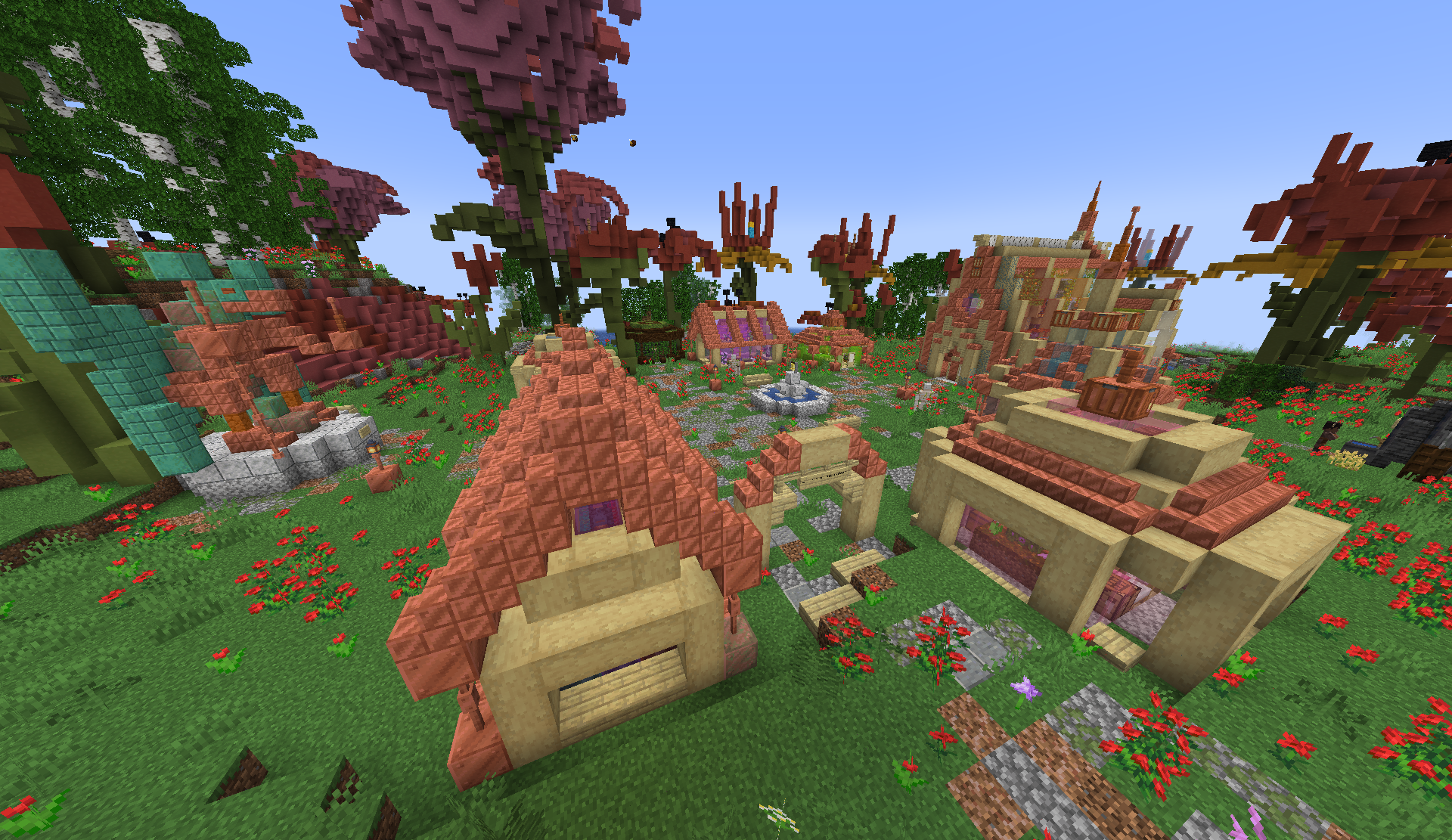 Marahza is a small village, comprising only eight buildings in total. Each of these buildings is, in some way, a greenhouse, themed around growing a different kind of flower or crop, and often themed around a color. Buildings are all built of birch wood (usually stripped) and waxed cut copper.